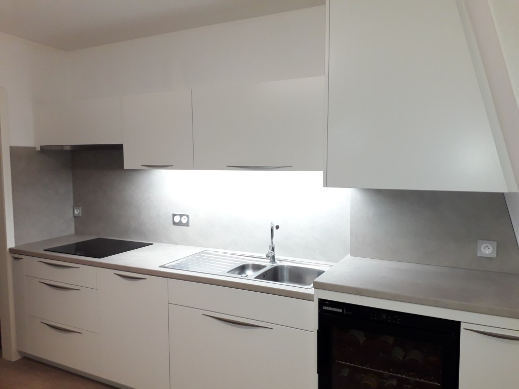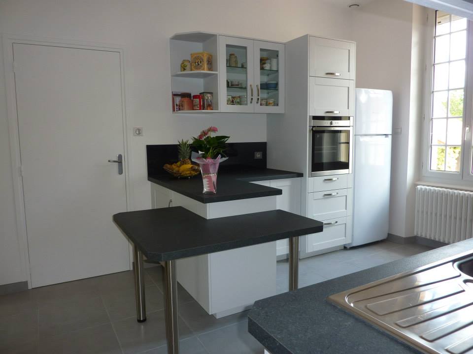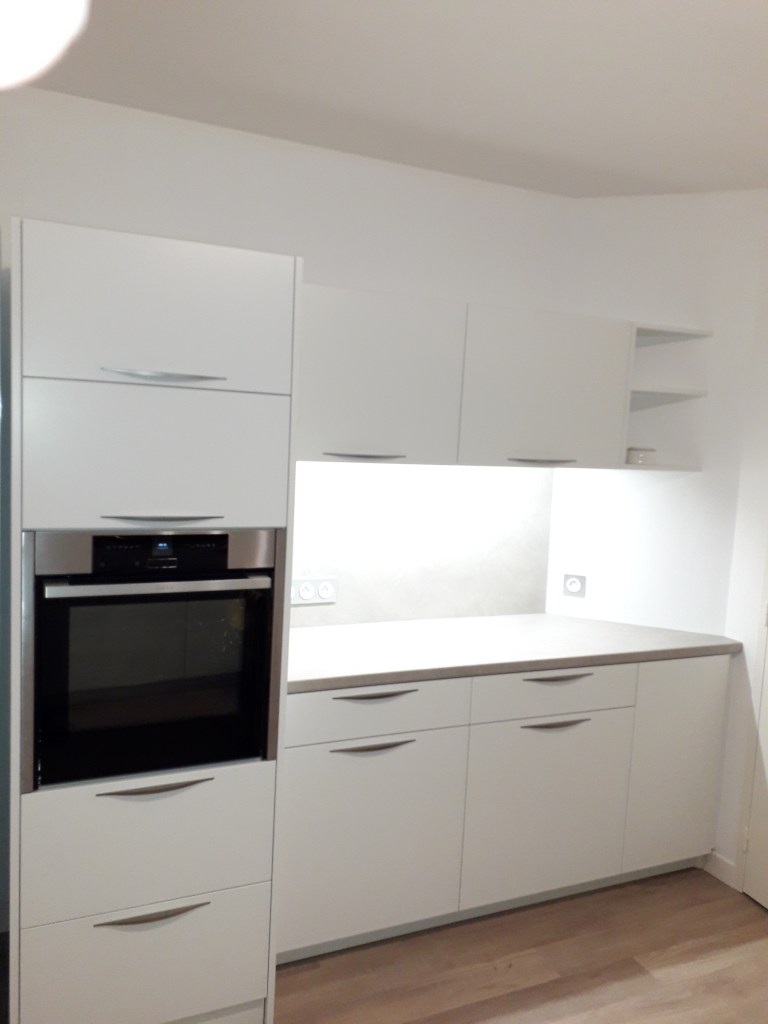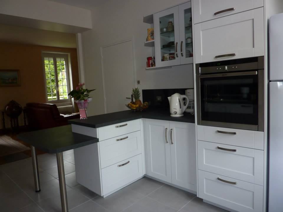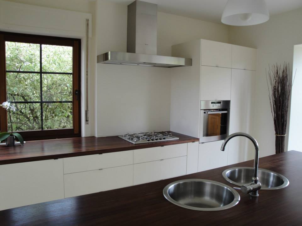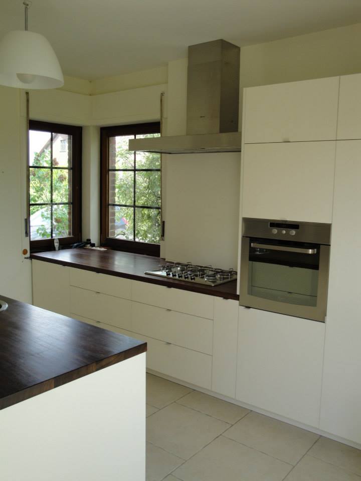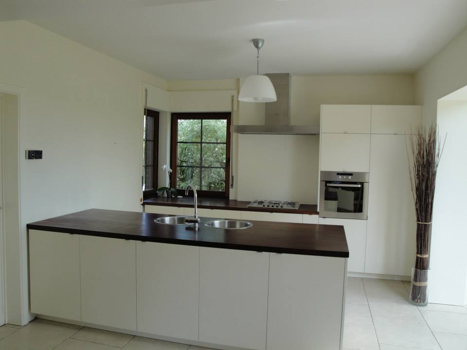 Cuisine en stratifié blanc cassé – plan de travail en Padouk