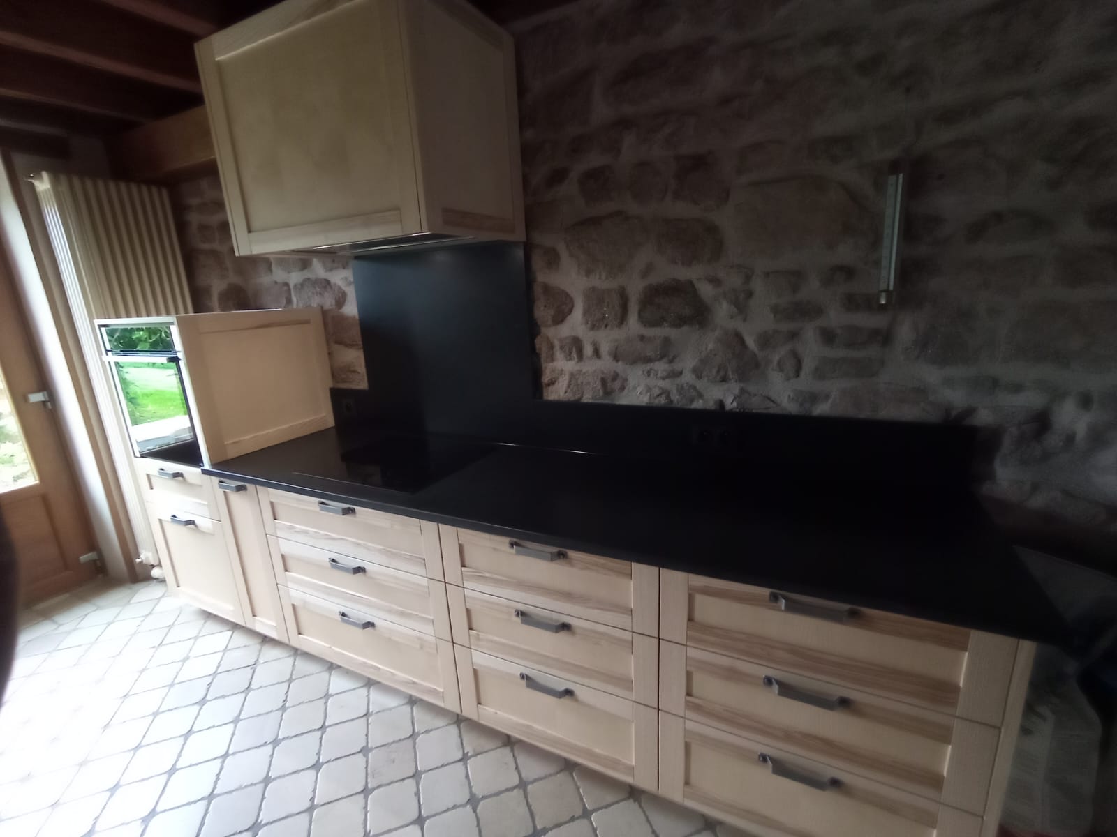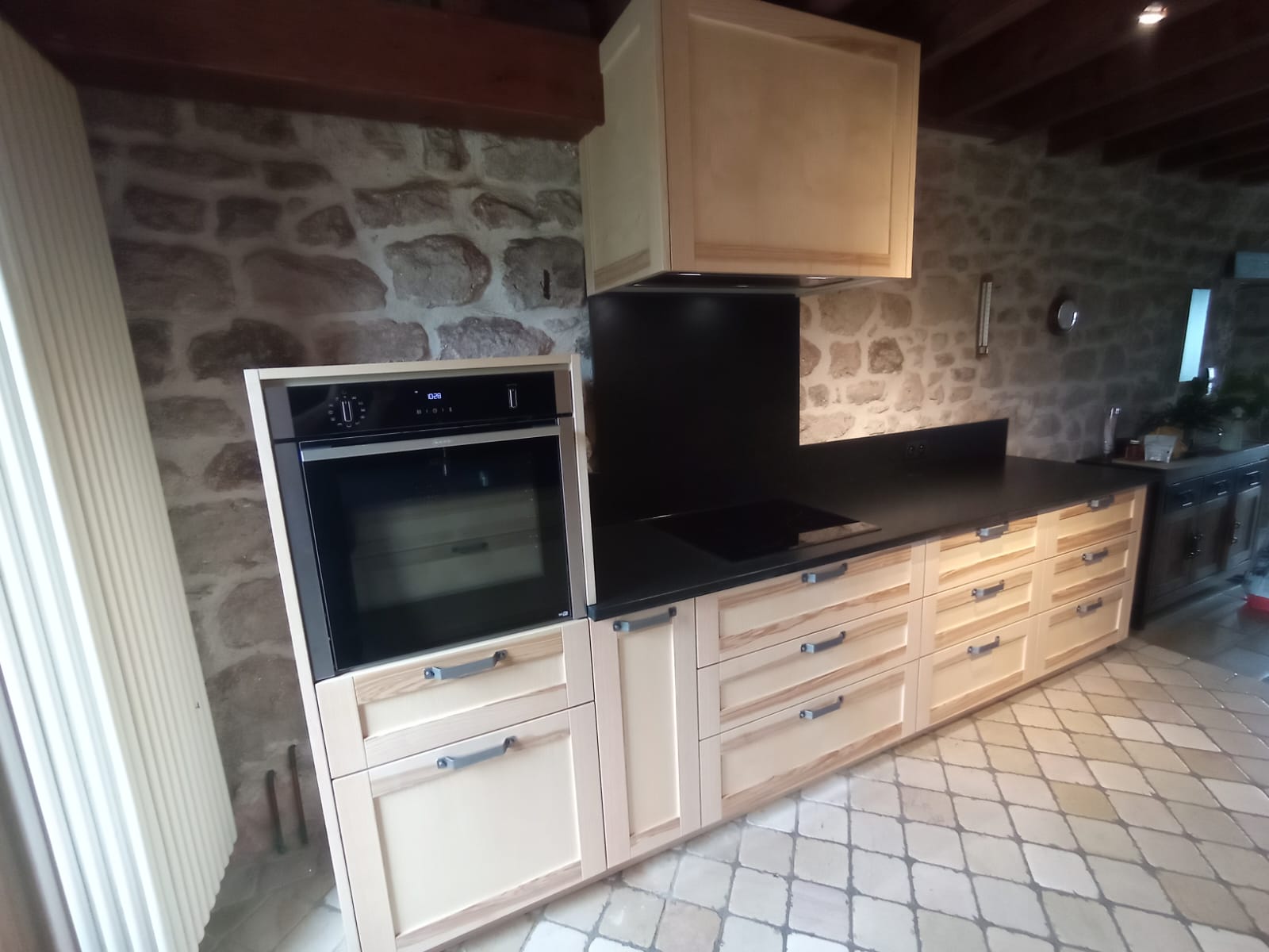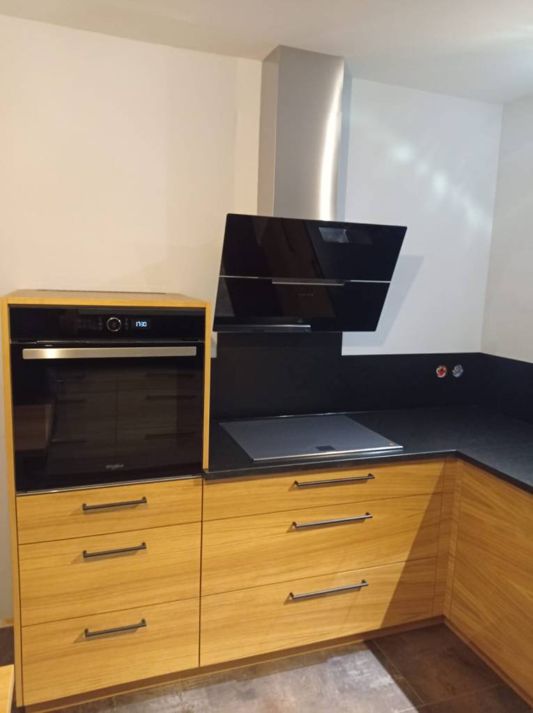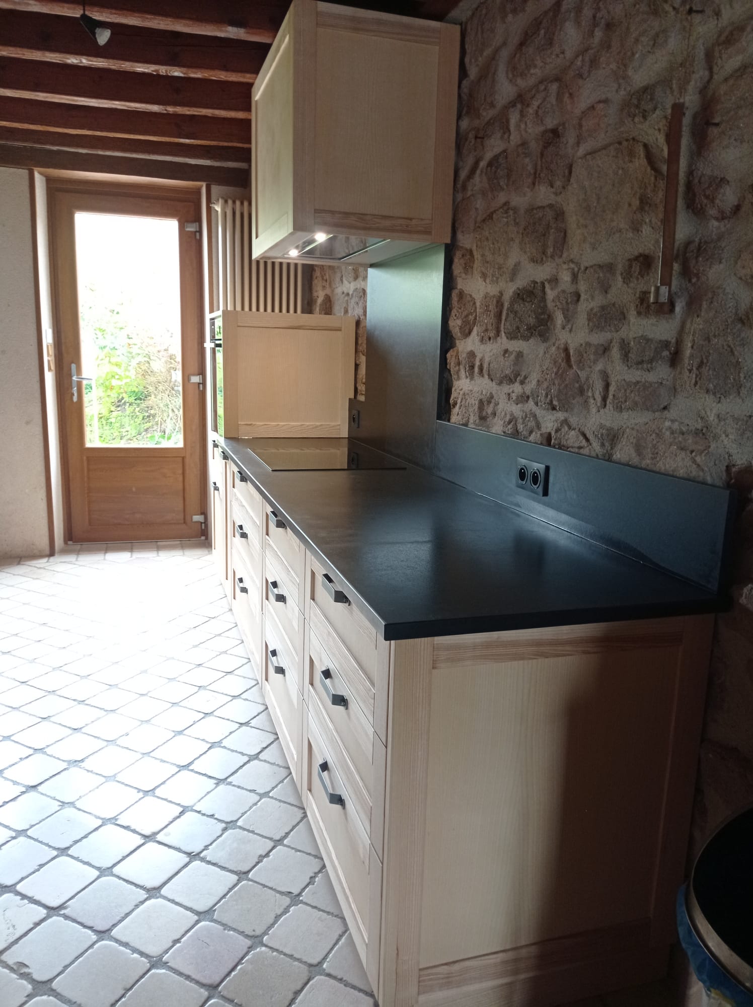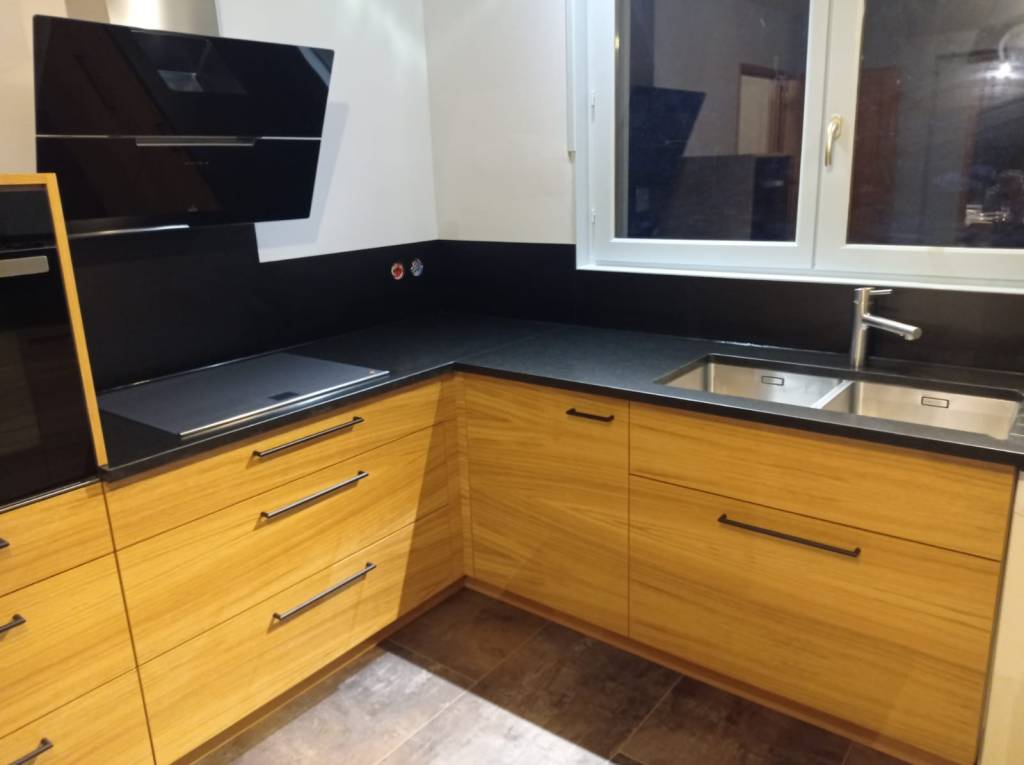 Cuisine en panneau chêne – plan de travail en granit noir effet cuir
