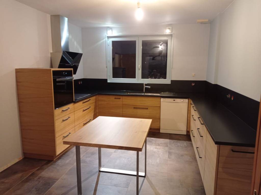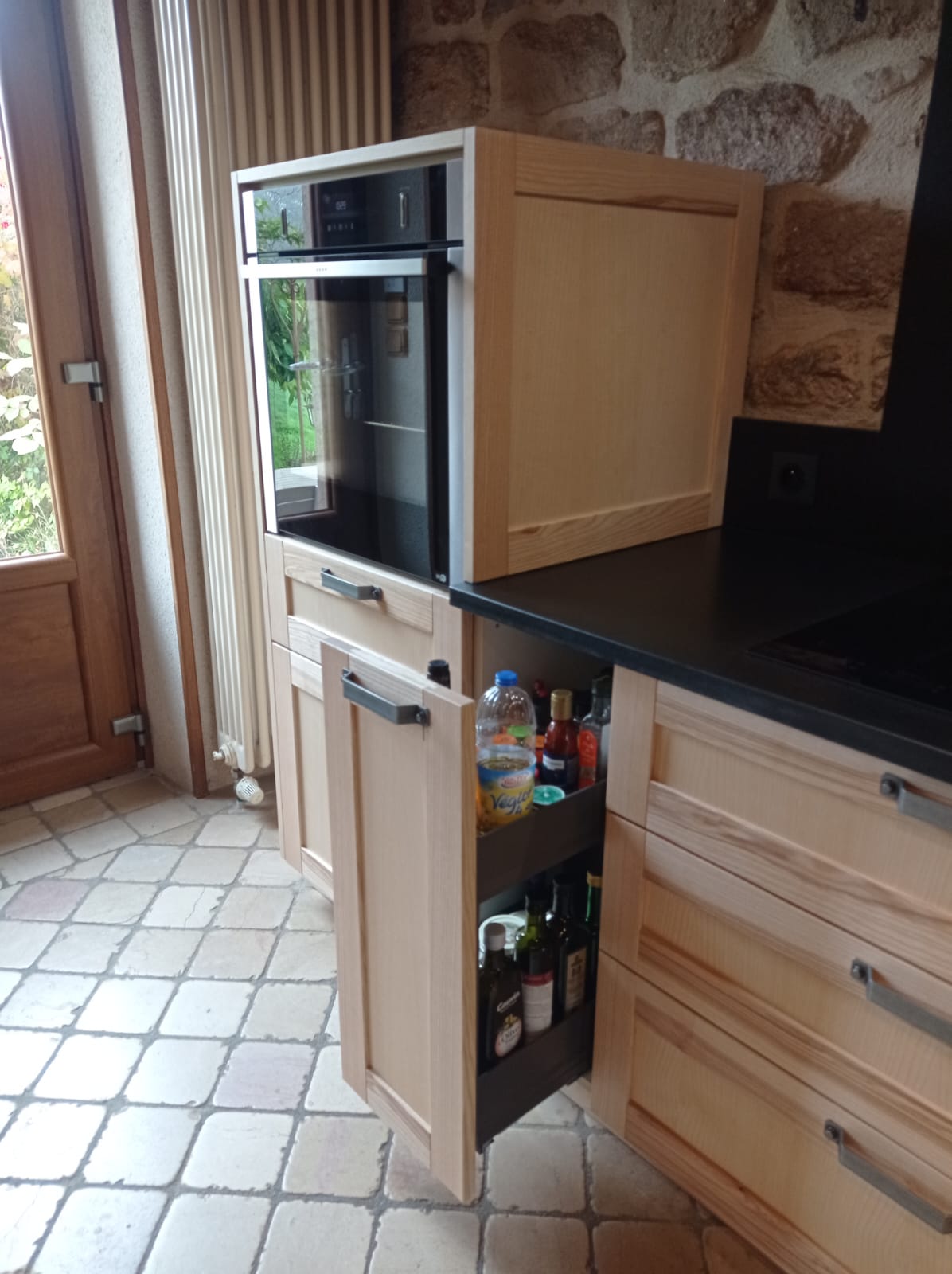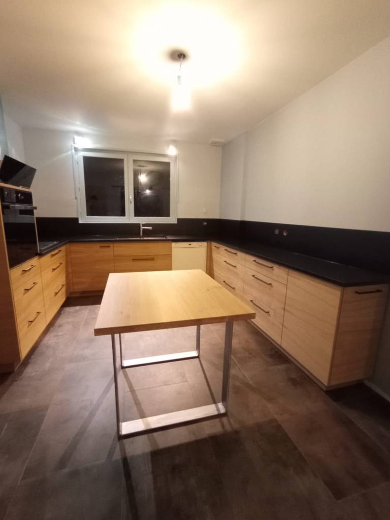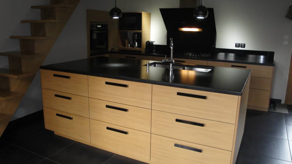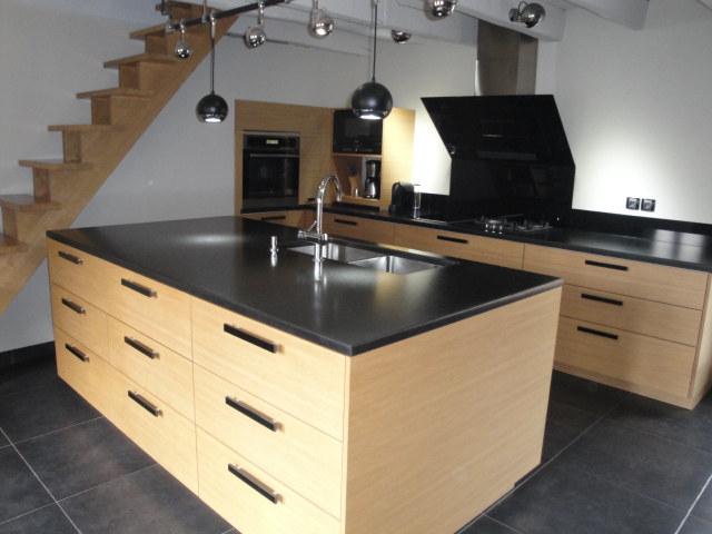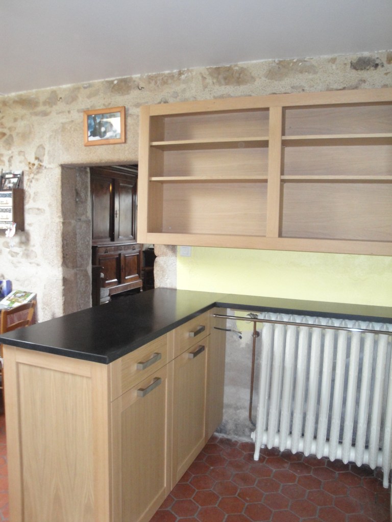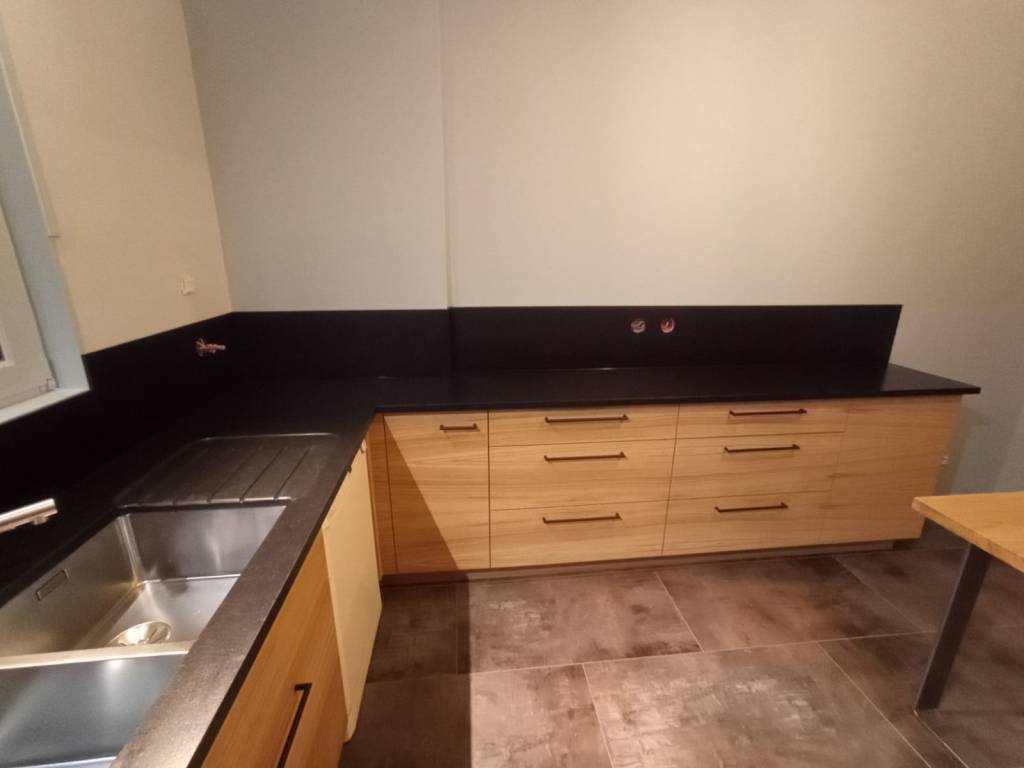 Cuisine en panneau chêne – plan de travail en granit noir effet cuir