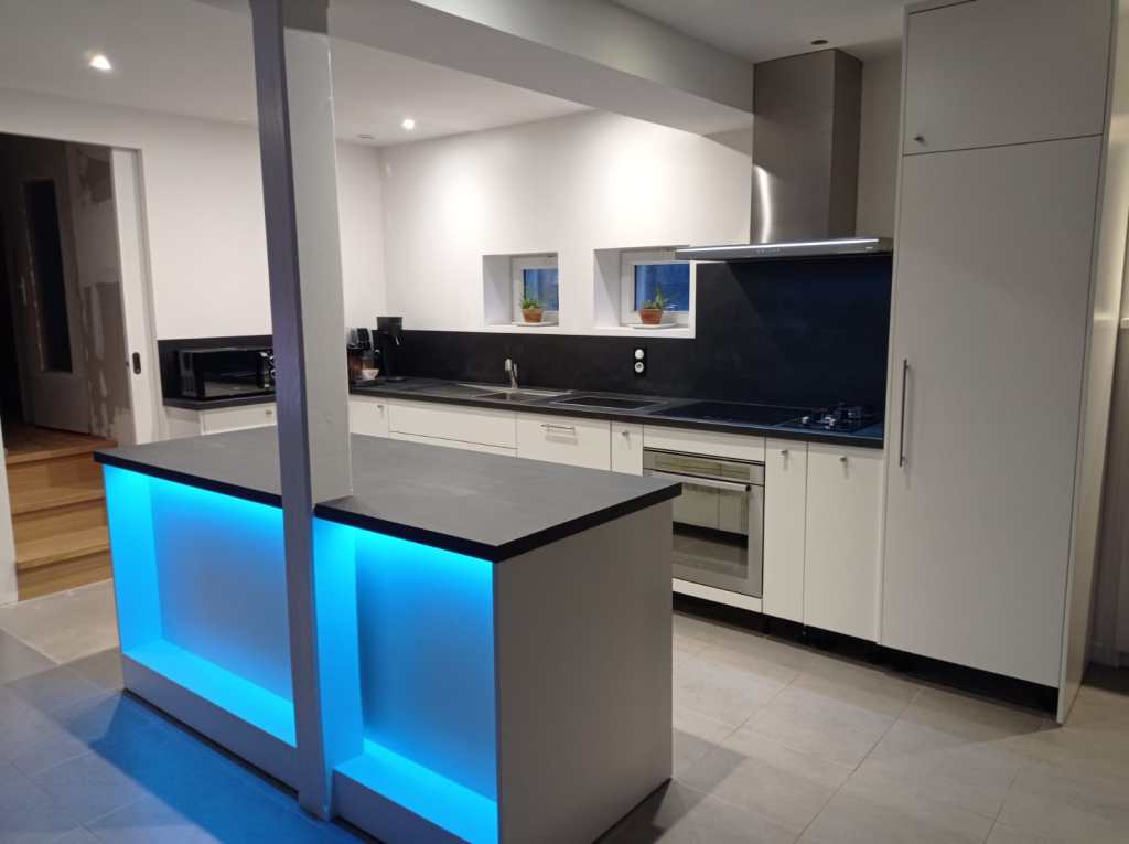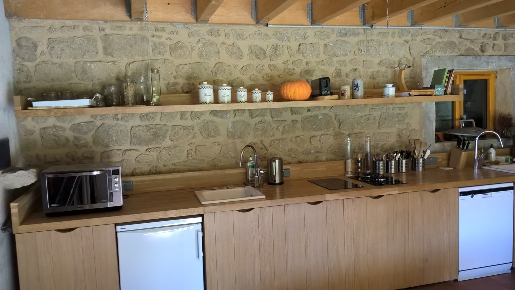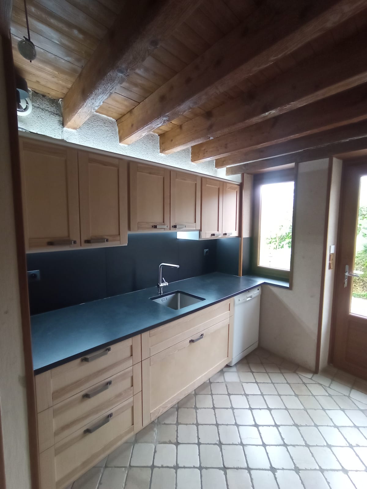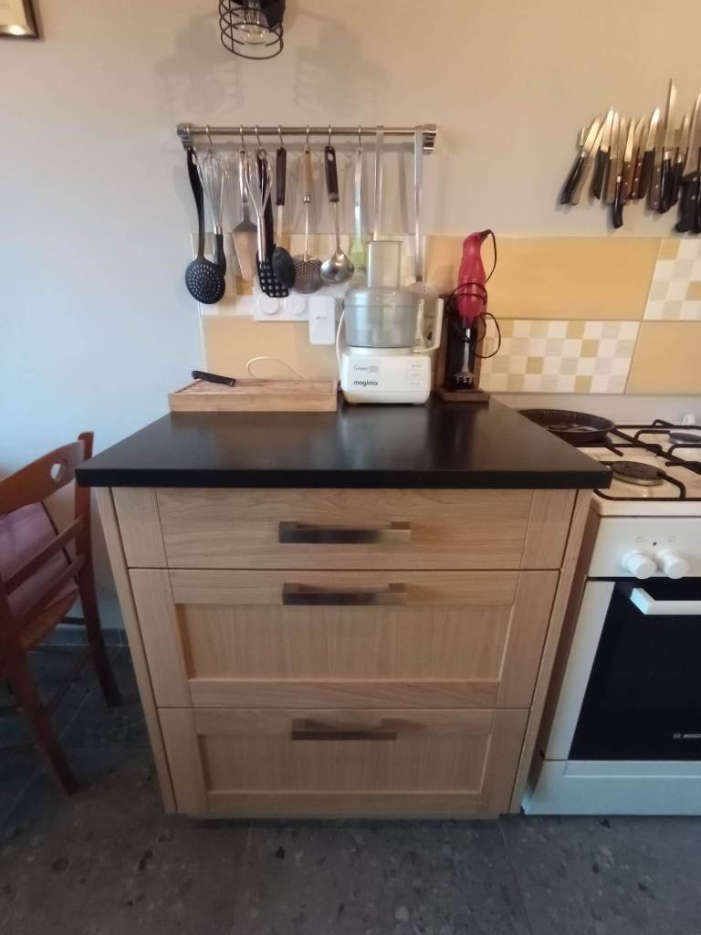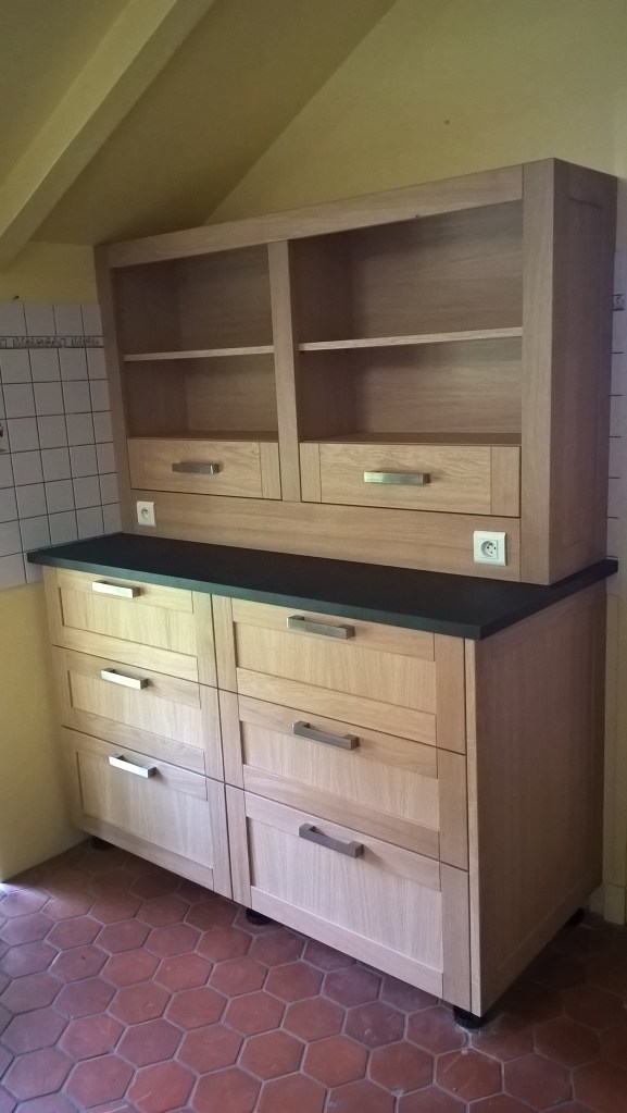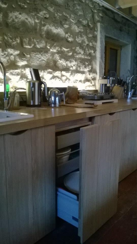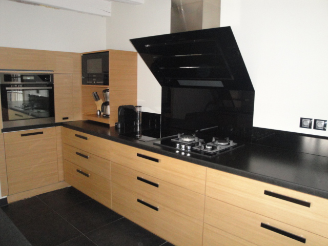 Cuisine en panneau chêne – plan de travail en granit noir effet cuir