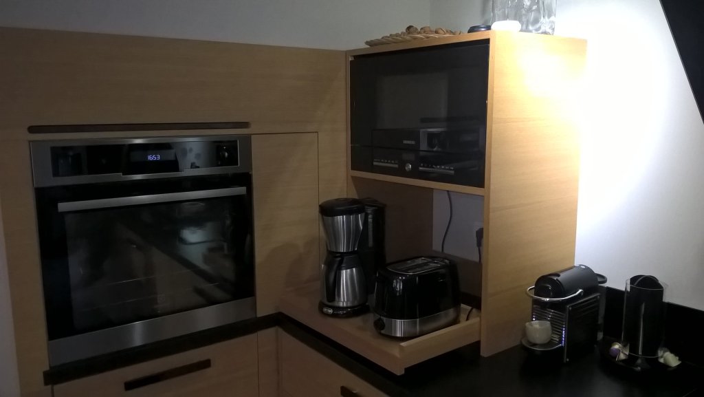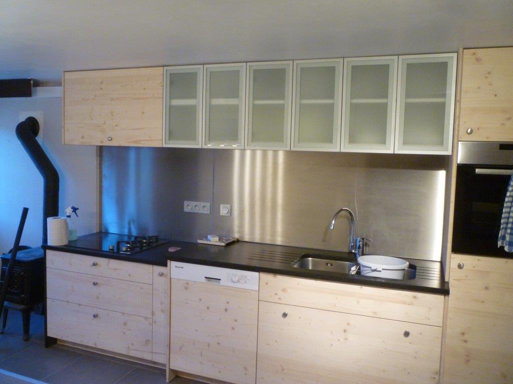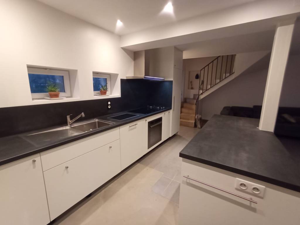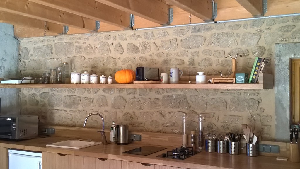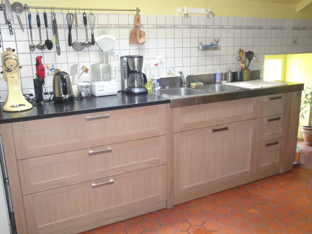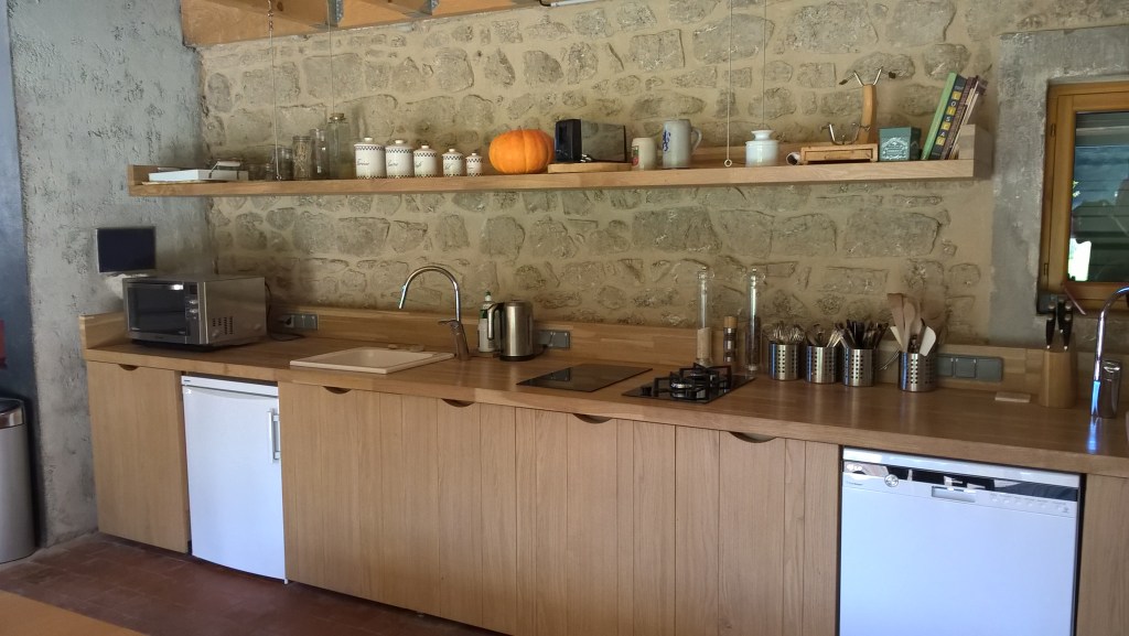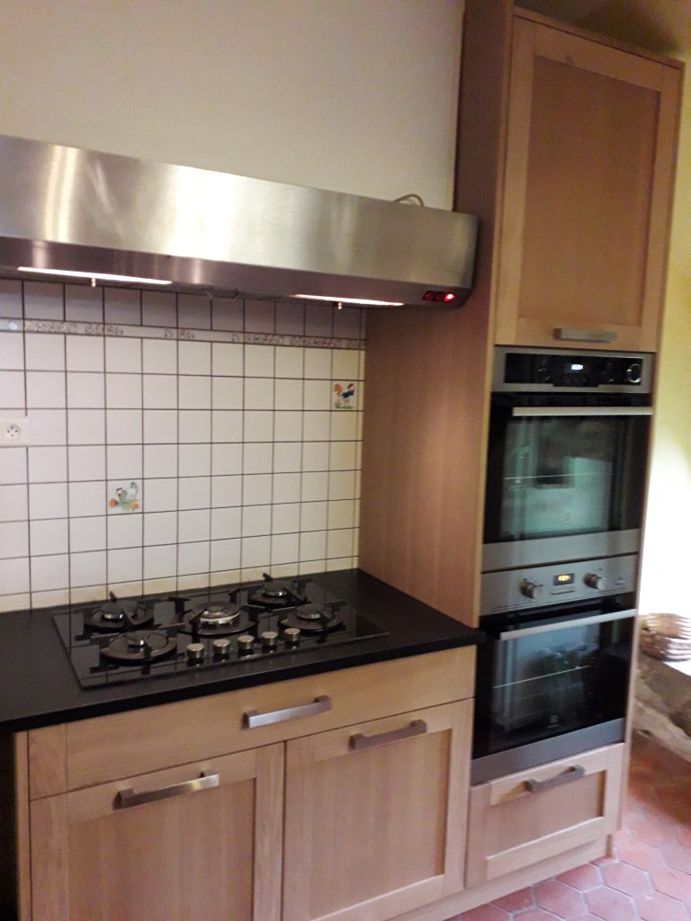 Cuisine en panneau chêne – plan de travail en granit noir effet cuir