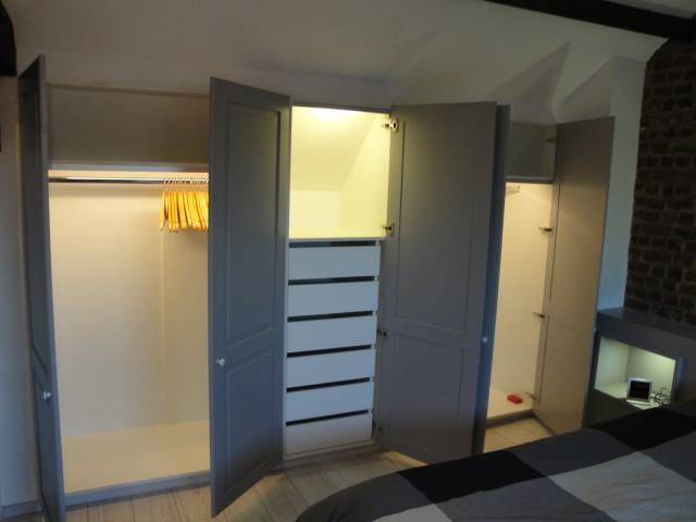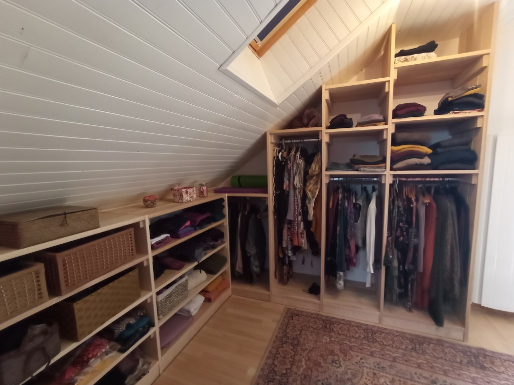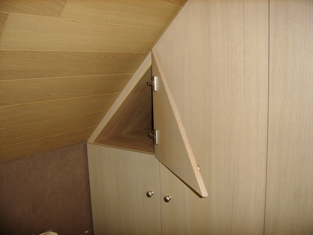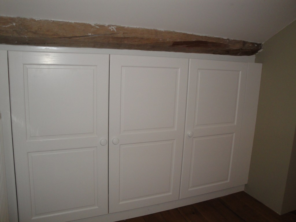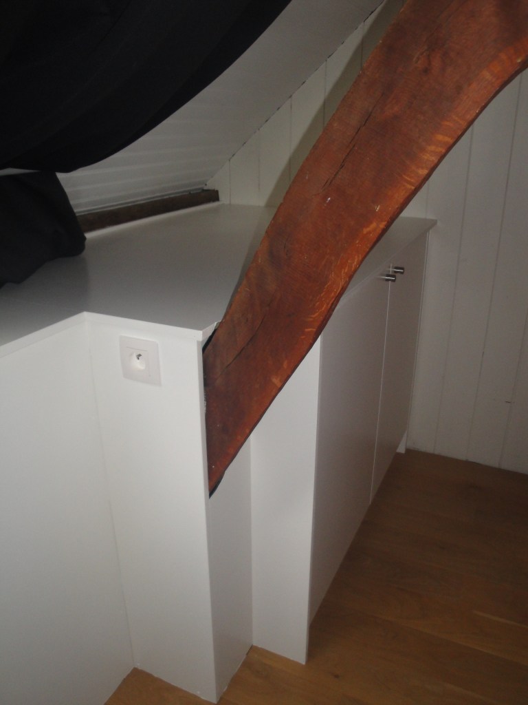 Agencement de placards en sous pente, autour de la charpente apparente