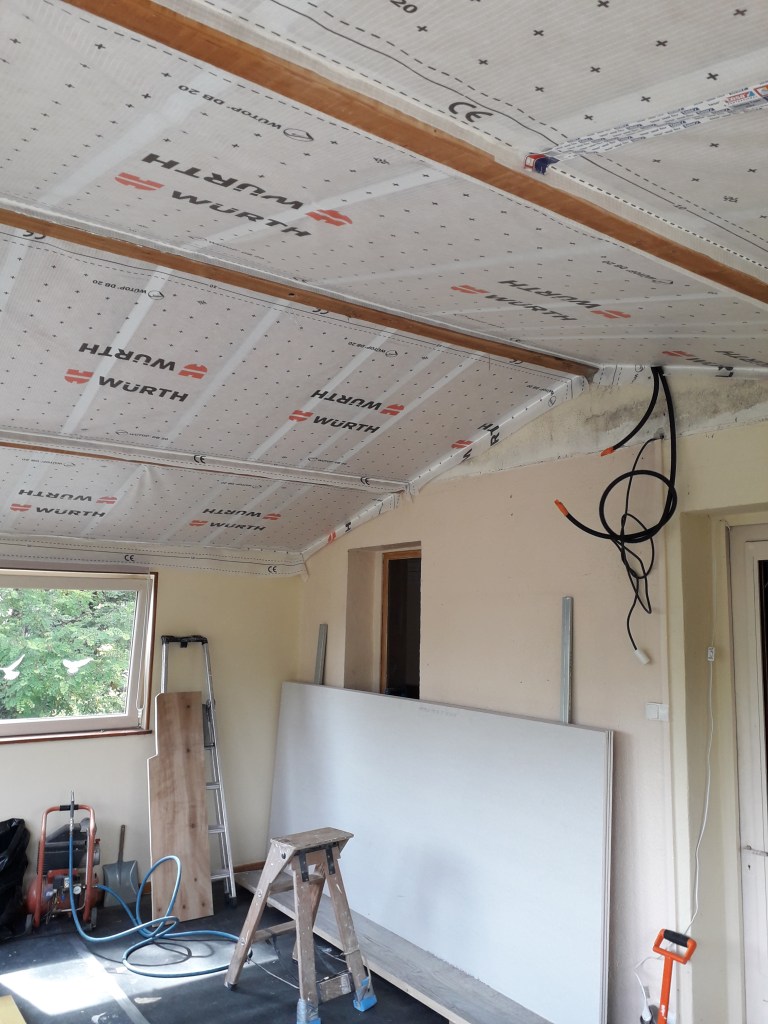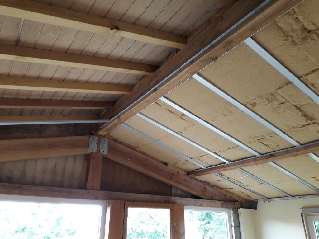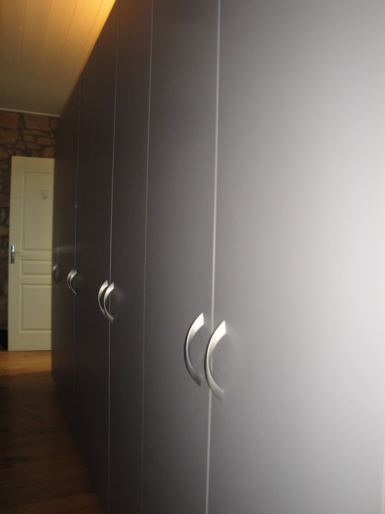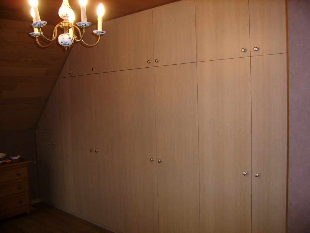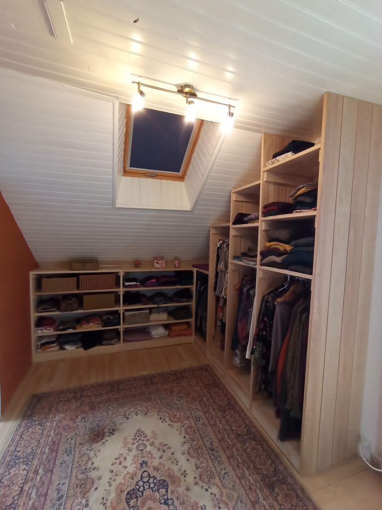 Agencement de placards en sous pente, autour de la charpente apparente