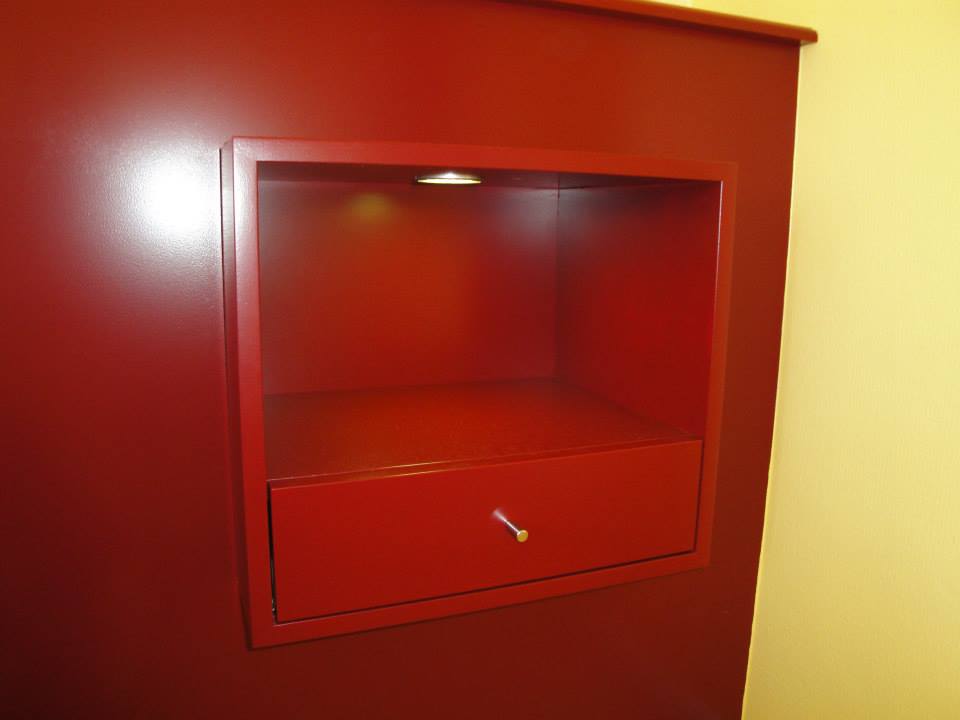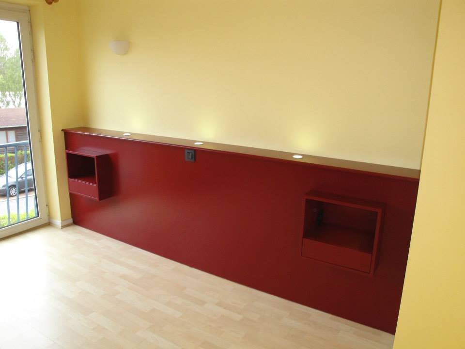 Agencement dressing avec portes coulissantes et tête de lit avec niches et éclairage intégrés